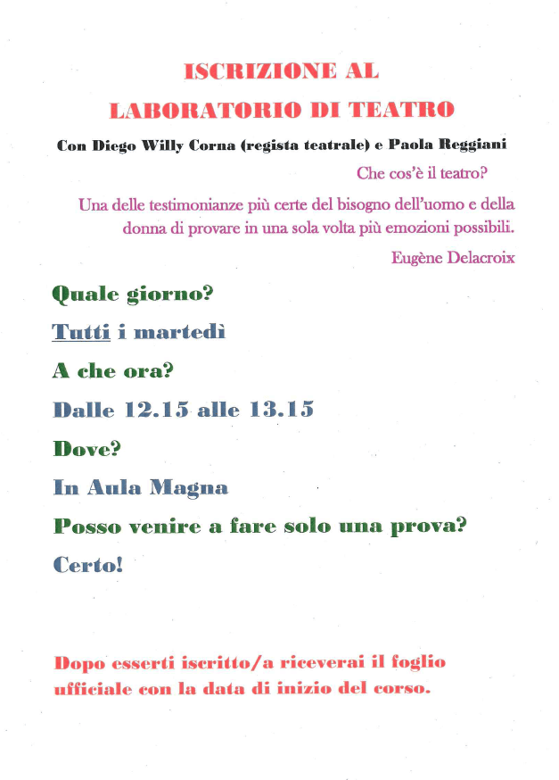 Monte ore 25/26 – Laboratorio di teatro from Settembre 16, 2025 to Novembre 30, 2025 Scheduled ical Google outlook Navigazione articoli Prove del gruppo di teatroMonte ore 25/26 – Giornalino scolastico